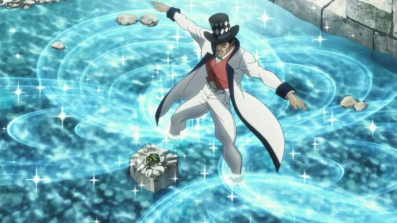 Zeppeli è il primo personaggio a comparire che usa le Onde, quindi, in veste di maestro non si occupa solo di addestrare Jonathan ma anche di spiegare al lettore i segreti dell’arte che egli padroneggia. La spiegazione di base è impregnata di biologia: attraverso la respirazione è possibile controllare sia la quantità di ossigeno nel sangue che il ritmo cardiaco modulando quindi le onde che gli esseri viventi propagano naturalmente. I motivi per cui le Onde sono così efficaci contro i vampiri e gli Uomini del Pilastro sono principalmente due: la frequenza delle onde emanate durante gli Overdrive sono le stesse delle onde solari; l’esempio portato poi da Zeppeli con le increspature dell’acqua, che per essere “cancellate” devono essere investite da altre onde più forti. Questa seconda spiegazione mi è sempre piaciuta parecchio, poichè permette di speculare anche sulla natura della Maschera di Pietra che Zeppeli stesso definisce come le due facce della stessa medaglia. Se le onde solari e vitali sono opposte alle “non-onde” emanate dai non morti trovano spiegazione anche piccoli particolari, come le capacità lenitive delle prime e i poteri dei vampiri incentrati soprattutto sull’assorbimento di energia vitale, o del sangue (che sono la stessa cosa, poichè l’ossigeno, l’energia usata dalle cellule, è trasportato dal sangue). È come se i primi uomini ad aver padroneggiato le Onde abbiano deciso di combattere con la vita che loro stessi mettevano in gioco.