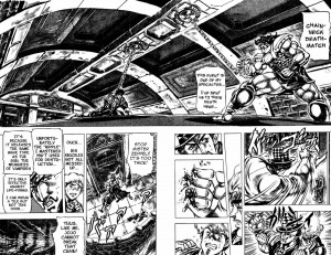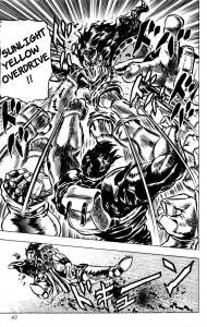 Adoro le prime due serie e lo stile di combattimento che Araki fa usare ai suoi personaggi: mi piacciano gli Stand ma essi, anche in base alla serie, danno vita situazioni e combattimenti di tipo completamente diverso. La differenza non è lampante con Phantom Blood, dove l’uso delle Onde è abbastanza lineare e diretto, ma lo diventa con la seconda serie Battle Tendency: credo che sostanzialmente, la differenza tra le Onde e gli Stand risiedeva nelle spiegazioni che Araki proponeva o inventava per sbalordire il suo pubblico di volta in volta. Con le Onde le possibilità di spaziare sono infinite, ma ogni volta si trovava a dover presentare una giustificazione o una spiegazione (plausibile o meno) per il successo di un azione, mentre con gli Stand, potendo dare per scontato il possesso di un determinato potere, è possibile focalizzarsi soprattutto sull’uso creativo che i personaggi fanno delle loro abilità. Credo che la scelta di utilizzare gli Stand sia stata più che azzeccata, sarebbe stato a mio avviso impossibile gestire un fumetto per due decenni con le Onde (per quanto meraviglioso sarebbe stato in caso di successo), che sono tanto spettacolari quanto difficili da usare in mancanza di un’idea che possa risultare gradita al pubblico: basti pensare che il numero di combattimenti totali con le Onde presenti nelle prime due serie è veramente limitato! Senza considerare che la terza serie da sola è più lunga della prima e della seconda messe insieme…