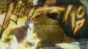 Dio viene messo a dura prova da Jonathan dopo aver disonorato Erina, ma a differenza dell’avversario ha maggior risoluzione, il fatto che tiri fuori il coltello dimostra che è disposto a uccidere;