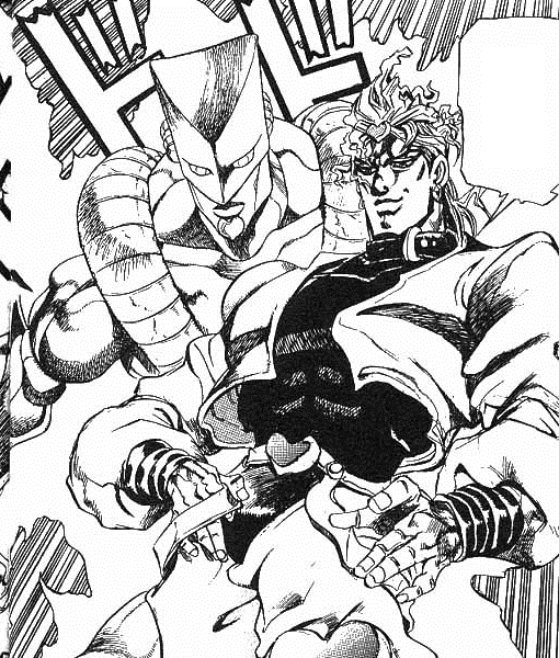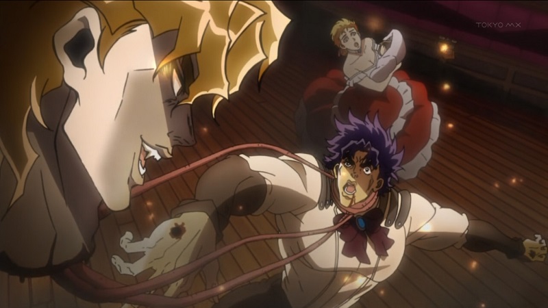 Dio viene messo a dura prova da Jonathan dopo aver disonorato Erina, ma a differenza dell’avversario ha maggior risoluzione, il fatto che tiri fuori il coltello dimostra che è disposto a uccidere;
