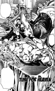 Ovviamente tutto questo era possibile con Phantom Blood (ed entro un certo limite anche con Battle Tendency) perchè questa serie è composta da quarantaquattro capitoli da una ventina di pagine; nelle serie successive il ritmo di Araki è comunque sempre molto serrato ma vista la lunghezza i climax narrativi sono gestiti in altro modo. Ciò non toglie che Dio è il miglior cattivo mai creato da Araki: non posso fare a meno di adorare personaggi come Yoshikage Kira, Diavolo e Pucci (soprattutto il primo e il terzo ndRegola) ma allo stesso tempo è come se tutta l’opera di questo mangaka fosse influenzata dalla figura del primo personaggio ad essere comparso nella prima serie… Dio Brando influenza anche le serie di Jojo in cui non compare! Un personaggio che negli anni è cambiato: nella terza serie è un antagonista molto classico senza obiettivo specifico… anzi, ripensandoci, è quasi come se voglia farsi i fatti suoi ma il destino ha reso inevitabile lo scontro con i Joestar (per il problema sofferto dalla madre di Jotaro). Addirittura negli anni ci vengono mostrati aspetti diversi di Dio, come la comparsa di suo figlio Giorno… cosa resa possibile probabilmente dal corpo di Jonathan Joestar di cui Dio si impossessa alla fine; diventa addirittura un intellettuale edonista nei flashback di Pucci nella sesta! (Se permettete la parentesi, questa cosa mi ha molto ricordato l’effetto voluto da Anne Rice nella costruzione del suo personaggio di maggior successo, Lestat, descritto come un mostro senza pregi nel racconto di Louis e, perl’appunto, come un intellettuale edonista nel secondo libro Scelti dalle Tenebre.)
