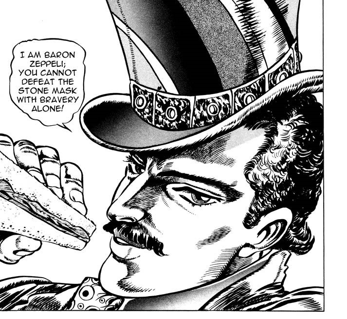 Voglio iniziare con Will Anthonio Zeppeli, il coprotagonista di Phantom Blood per eccellenza, e per svariati motivi il mio personaggio preferito di questa serie. Zeppeli compare nella vita di Jonathan portando una terribile notizia: Dio non è morto nell’incendio della residenza Joestar, ma si è salvato grazie ai terrificanti poteri della Maschera di Pietra, quindi il mondo non è ancora salvo. Eppure quest’uomo buffamente vestito e con una passione per i cibi pepati porta con se anche la speranza, poichè insegnerà a Jonathan a padroneggiare l’unica arma efficace contro i vampiri: le Onde Concentriche dell’Arte dell’Eremita, di cui parleremo accuratamente in un prossimo appuntamento. Ma Zeppeli non è stato solo il maestro di Jonathan, è stato anche amico e compagno nella lotta contro le creature della notte, vicino come un fratello ma protettivo come un padre nei suoi confronti, lo supporta con tutto se stesso anche nel momento della sua morte ponendo la salvezza degli altri sempre davanti alla propria.. Perchè se c’è una caratteristica che accomuna tutti gli Zeppeli è il destino di perire di una morte spesso tra le più brutali mai disegnate da Araki: sono persone orgogliose che affrontano il loro fatale destino senza timore e essendo di supporto al Joestar di turno fino alla fine. Per questo motivo spesso hanno un carattere difficile da trattare, ma sono indubbiamente le persone più buone e disposte al sacrificio presenti in tutto Jojo: nel caso particolare Will Zeppeli, sebbene conscio della sua morte certa non si tira di fronte al pericolo affrontando con una freddezza e una compostezza incredibili anche le situazioni più terribili… indipendentemente dal fato sarà proprio il suo buon cuore a tradirlo e fargli affrontare a viso aperto un pericolo mortale (Zeppeli perde la sua compostezza quando vede Jonathan in difficoltà). E come se non bastasse come potremmo non amare questa famiglia dalle origini italiane!