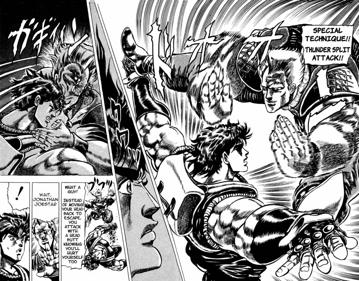 Quando la prima serie volge alla fine compaiono altri tre personaggi: Dire, Straits e Tompetty (Tonpeti in alcune traduzioni), chiamati da Zeppeli per aiutarli nella lotta contro i mostri creati dalla Maschera; questi arrivano quando oramai Zeppeli è già caduto in battaglia per mano di Tarkus. Questi personaggi fanno a dire il vero ben poco, e hanno un ruolo piccolo nella storia; mi permettono comunque di approfondire due tematiche splendidamente “manga”, che si respirano soprattutto nelle prime due serie del lavoro di Araki. Il primo a comparire dei tre è Dire, amico di Zeppeli che appena apparso decide di mettere alla prova Jonathan con quella che è la versione meno offensiva della sua tecnica mortale, la Thunder Split Attack, che diventa completa e a detta di Dire invincibile nella sua versione “Cross“, usata contro Dio. È un attacco che si base sul colpire alla testa l’avversario bloccando la sue braccia e impedendogli quindi di difendersi con le proprie gambe: la classica tecnica squisitamente manga presentata come infallibile. Ovviamente questo attacco fallisce due volte, anche la sua versione completa non è in grado di preoccupare Dio, e Dire muore poche pagine dopo essere apparso. Ho sempre fatto appello a questo personaggio, e la sua terribile fine, per sostenere l’idea che in un manga tutte quelle tecniche basate su costruzioni logiche “a priori“, o sul mero calcolo per ridurre a zero le possibilità di evaderle (questo attacco colpisce a 360°! cit. qualunque personaggio manga secondario), tendono spesso a fallire miseramente, ed è dimostrato anche dal fatto che una rosa sputata con astio risulta essere molto più pericolosa. L’essenza e le probabilità di successo di un attacco in un manga dipendono soprattutto dal sentimento che l’ha fatto scaturire: Dire, morendo, mi ha insegnato e mi ricorda ogni volta soprattutto questo. (Non dimenticate inoltre quanto sia importante urlare il nome della tecnica perchè abbia effetto ndRegola.)