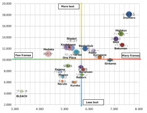 Vi propongo qui di seguito un grafico incentrato sull’analisi di tutti i manga della Shonen Jump. Esso compara le diverse serie basandosi sul rapporto testo/vignette. In sostanza, mette a confronto diverse opere per farne risultare alcuni aspetti, come ad esempio il manga con il maggior numero di vignette o quello con più discorsi. Per realizzare il grafico sono stati presi in considerazione tre capitoli consecutivi di ogni opera presente nella testata ed è stato contato il numero di vignette e di linee di testo presente in ognuna di esse.