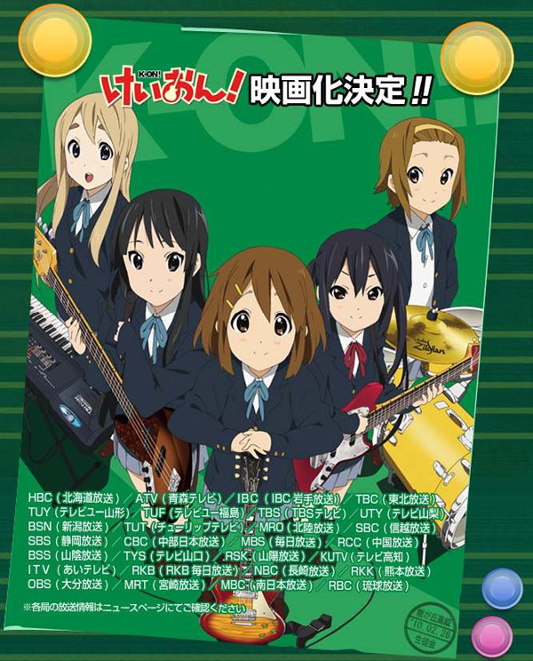 Il film che sarà proiettato in più di 130 cinema nel bell’arcipelago parlerà delle vicissitudini del gruppo di musica leggera durante il periodo delle superiori, vicende non mostrate né nella prima né nella seconda serie. La produzione è stata affidata alla Kyoto Animation, lo stesso studio di animazione che si è occupato della serie animata di entrambe le stagioni e il regista sarà Naoko Yamada. Come logico che sia quindi anche il doppiaggio non presenterà differenza alcuna: Satou Satomi 佐藤聡美 sarà la doppiatrice di Ritsu, Hikasa Youko 日笠陽子 darà voce a Mio, Kotobuki Minako 寿美菜子 starà di nuovo per Tsumugi ed infine per la protagonista sarà Toyosaki Aki 豊崎愛生 ad interpretare Yui.