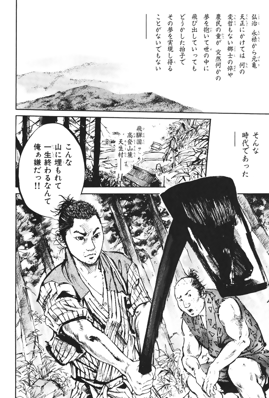 Mentre questo più famoso seinen storico di Takayuki Yamaguchi si colloca già nel periodo Edo, Kagemusha ci permette di rivivere la confusione e la frenesia degli eventi che caratterizzano invece l’epoca Sengoku facendo in modo che personaggio protagonista e lettore siano inizialmente sullo stesso piano. Entrambi sono infatti lontani da quel mondo di lotte intestine e guerre continue: il lettore per l’ovvia barriera temporale, mentre per il protagonista la distanza è spaziale visto che tutte le vicende si svolgono nel paese di Hida, un luogo che guardava da lontano ciò che stava accadendo nel resto del Giappone grazie alla natura impervia delle montagne dove è situato.