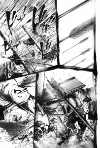 Proprio le battaglie rappresentano i momenti di sintesi perfetta degli elementi peculiari dello stile di disegno di Kurofuji: un character design dei volti molto moderno, quasi come se quella rappresentata fosse l’accurata ricostruzione di quel mondo fatta da attori dei giorni nostri e che si amalgama benissimo con l’accuratezza e la precisione con cui sono disegnati elementi architettonici, armature e così via. Questa freschezza nei delineare le figure va però a fondersi con una classicità che non può non caratterizzare un’opera storica: il disegno è infatti “sporco”, inchiostrato grossolanamente con il pennello con un tratto che diventa poi particolarmente carico nelle scene di azione.