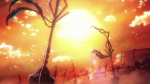 Kaminai è una serie incentrata sul viaggio della piccola Ai alla ricerca della sua identità e sulle ragioni che hanno portato il mondo allo stato attuale: esplorazione e mistero sono al centro della vicenda, che ho trovato sufficientemente intrigante dal proseguire nella visione nella speranza di avere, presto o tardi una spiegazione (di storie di gente che non muore, ne ho lette/viste tante, e questa mi ha ricordato per certi aspetti Torchwood 4 Miracle Day, serie televisiva sci-fi inglese degli ultimi anni ndRegola). Bisogna semplicemente vedere se i colpi di scena, e gli sviluppi di questa storia saranno all’altezza delle aspettative nutrite da queste prime battute, comunque non troppo eccellenti: nonostante il tocco macabro che la vicenda prende in alcuni frangenti, la protagonista è della tipologia loli che tanto sembra spopolare nelle serie estive, cosa che mi fa supporre che quest’anime avrà tematiche soprattutto horror. Le animazioni nella prima parte non mi sono sembrate portentose, ma neppure scadenti, da vedere se nel corso dei prossimi episodi verranno mantenuti questi standard; in alcune schermate, soprattutto in quelle di viaggio ho riscontrato il riciclo di modelli 3D in computer grafica, con la quale sono stati certamente realizzati molti degli ambienti di questa serie. I colori usati (come potete vedere dalle immagini che ho scelto) sono spesso caldi, molto intensi, e trasmettono quella tipica sensazione di calore che accomuna un pò tutti gli scenari post-apocalittici.