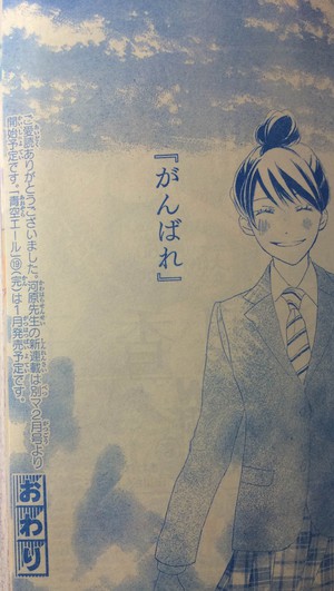 Martedì di questa settimana, con la pubblicazione del numero di Novembre della rivista Bessatsu Margaret edita dalla Shueisha è stato annunciato che Kazune Kawahara lancerà una nuova serie il cui primo capitolo sarà pubblicato sul numero di Febbraio della rivista stessa, in vendita, a tutti gli effetti, a Gennaio del prossimo anno. L’annuncio è stato pubblicato sulla pagina conclusiva di un altro manga dell’autrice, intitolato Aozora Yell, che si è concluso sullo stesso numero di Bessatsu Margaret. Il 19esimo e ultimo volumetto di Aozora Yell sarà pubblicato dalla Shueisha a Gennaio dell’anno prossimo, probabilmente in concomitanza con l’uscita della nuova serie.