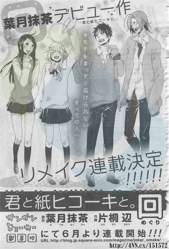 Martedì di questa settimana, con la pubblicazione del numero di maggio della rivista Gangan Joker edita dalla casa editrice Square Enix sarà annunciato ufficialmente il lancio di un nuovo manga. Si tratta a tutti gli effetti di un remake da parte dell’autrice Atari Katagiri (Vampire Hunter) del manga Kimi to Kami Hikōki to. (Tu, un aeroplano di carta e…), il primissimo manga di Matcha Hazuki autrice di Isshūkan Friends (Amici per una settimana). Il primo capitolo del remake sarà pubblicato sul numero di giugno di Gangan Joker e sarà intitolato Kimi to Kami Hikōki to Meguri (Tu, un aeroplano di carta, e… rotazione.)