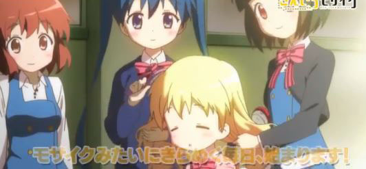 Martedì di questa settimana, la compagnia di produzione Media Factory ha cominciato a trasmettere in televisione un nuovo video promozionale, della durata di quindici secondi , dell’anime Kin-iro Mosaic (Un mosaico color oro) tratto dall’omonimo yonkoma manga (manga di quattro pannelli) di Yui Hara. Il video presenta la sigla di chiusura della serie stessa, la canzone Your Voice interpretata dalle doppiatrici Asuka Nishi (Shinobu Ōmiya), Manami Tanaka (Alice Cartelet), Risa Taneda (Aya Komichi), Nao Tōyama (Karen Kujō), e Yumi Uchiyama (Yōko Inokuma) riunite sotto il nome del nuovo gruppo Rhodanthe*. Inoltre, nel corso del video stesso si può ascoltare la studentessa Shinobu mentre esprime il proprio entusiasmo nel vedere come le sue amiche abbiano accolto la studentessa straniera Alice.
