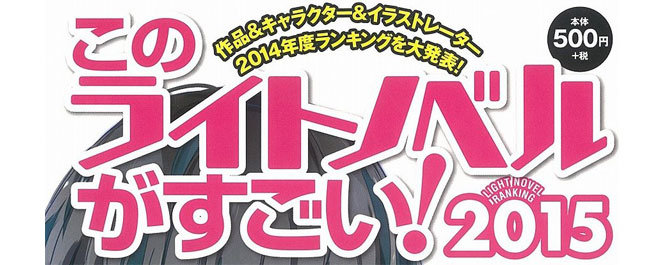 Venerdì di questa settimana è stata pubblicata la guida del 2015 edita dalla Takarajimasha intitolata Kono Light Novel ga Sugoi! (Questa Light Novel è eccezionale!). Con la pubblicazione di questo nuovo volume è stato reso disponibile l’elenco delle dieci light novel migliori pubblicate nel corso del 2014.