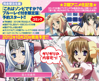 La Kadokawa Shoten, la cui Fujimi Shobo pubblica sulla rivista Monthly Dragon Age il manga di Sacchi Kore wa Zombie Desu ka? (Questo è uno zombie?), ha annunciato che il sesto volume del manga uscirà con in allegato in edizione limitata un disco Blu-ray. All’interno del disco sarà contenuto l’episodio 11 della seconda serie animata di Kore wa Zombie Desu ka, inedito, e avrà una durata di ventiquattro minuti. Oltre al Blu-ray, l’edizione limitata del volumetto avrà una copertina illustrata in modo differente, un libriccino allegato contenente un racconto e una custodia per il Blu-ray stesso.