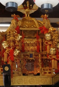 La parata vera e propria è arrivata la sera, quando lungo la shijo doori hanno sfilato gli altari dello yasaka jinja: tre enormi altari che vengono portati, tramite delle assi, sulle spalle di una folla di uomini vestiti di bianco, che si sforzano il più possibile di agitarli, di sollevarli per far sì che gli innumerevoli campanelli e le piastrine di metallo facciano più rumore possibile. Credo però che a parole non si possa descrivere, quindi eccovi il video. Scusate se ad un certo punto la telecamera balla, ma la mia amica è stata praticamente investita dalla marea umana