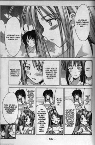 “Tsundere! Tsundere dappertutto!” come chiudevo la volta scorsa: ritengo che conoscere questa tipologia di personaggio sia propedeutico per avere una maggiore comprensione globale del mondo dei manga e degli anime. Il termine ha origine dalle espressioni “tsuntsun” (distaccato, irritato…) e “deredere” (affettuoso, dolce…) e indica quei personaggi che hanno nei confronti del protagonista atteggiamenti ambivalenti, a volte ostili altre amichevoli, caratterizzati da una scarsa fiducia in se stesse (non è un assoluto), relativa indipendenza e la paura di amare ed essere successivamente abbandonate. Questa paura, comune a quasi tutte le tsundere, le porta a non essere sincere con se stesse e spesso affermare l’opposto di quanto realmente pensano scavandosi la fossa con le loro mani e dando vita al più classico dei “tira e molla” col protagonista; gran parte dei personaggi di questo tipo desidera trovare qualcuno di cui fidarsi e che le protegga. Storicamente parlando le prime tsundere “moderne” a comparire sono Akane Tendo e Asuka Soryu Langley; da notare anche l’apporto dato dal personaggio di Lamù, sicuramente significativo, che tuttavia personalmente non riconosco appieno: una tsundere difficilmente insegue il protagonista (nelle prime battute), ed è spesso Lamù ad essere proattiva nei confronti di Ataru, che snobba le sue attenzioni. Una delle componenti caratteristiche delle tsundere è infatti l’immane fatica da sostenere per entrare nelle loro grazie! Lo stereotipo si stabilizza al cambio di secolo: sia per l’apporto di Ken Akamatsu e alcuni personaggi del suo manga (la protagonista Naru e la kendo-girl Motoko) sia la serie animata Rumbling Hearts del 2003 (ispirato all’eroge del 2001 Kimi ga Nozomu Eien). Eccovi una tavola presa dal capitolo 101 di Love Hina, che mostra un chiaro esempio di logica tsundere.