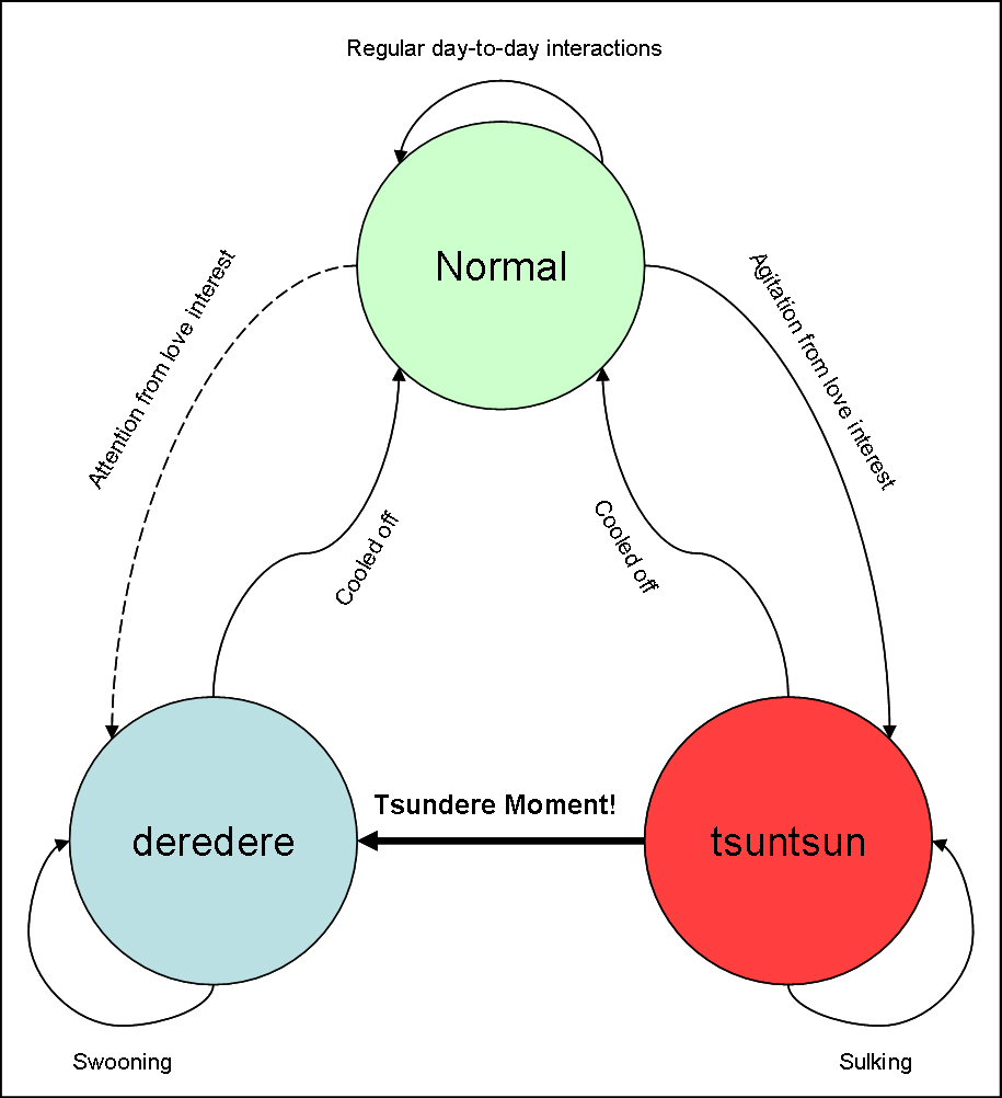 - tsunshun, usato per definire Ririchiyo Shiraikiin di Inu x Boku: tende a comportarsi come una tsundere e mantenere un atteggiamento quasi ostile verso tutti, ma quando lasciata da sola cade facilmente in depressione;
