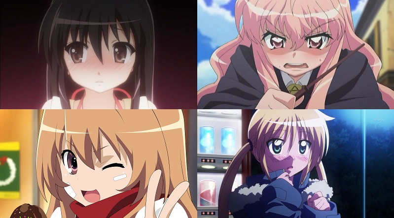 Negli ultimi dieci anni sono apparsi sempre più personaggi di questo tipo, a volte ortodossi, a volte hanno arricchito lo stereotipo. Altre volte, troppe, è stato etichettato come tsundere qualunque personaggio che avesse un atteggiamento di questo tipo: Sakura di Naruto, Rukia di Bleach e secondo un sondaggio di Biglobe anche Vegeta (ma lasciamo stare i loro pazzi sondaggi..). Io mi trovo estremamente contrario a questo allargamento poichè per quanto possano svilupparsi gli stereotipi devono restare semplici e ritengo si debba guardare soprattutto al contesto in cui essi vengono adoperati. Alcuni considerano Haruhi Suzumiya una tsundere ma il personaggio è più vicino alla tipologia “genki” (iperattivi e scalmanati) così come Hitagi Senjougahara di Bakemonogatari, la quale è lei stessa a definirsi in questo modo: sebbene gli atteggiamenti di Senjougahara siano condivisi anche da altri esponenti di questo stereotipo, il modo schietto con cui si rapporta al protagonista e la gelosia che mostra in certi momenti ne fanno una quasi-yandere (vedi sotto), ma sono propenso a considerarla un personaggio unico nel suo genere. Altri esempi di tsundere sono Kyou Fujibayashi (Clannad), Kagami Hiragi (Lucky Star), Tohsaka Rin (Fate/Stay Night), Mikoto Misaka (To Aru Majutsu no Index) e Hinagiku Katsura (Hayate no Gotoku).