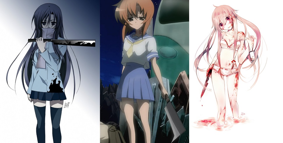 Di una pasta completamente diversa sono le yandere, stereotipo meno comune di recente successo: yanderu, da cui ha origine il termine (fondendosi con deredere), viene usato per indicare uno stato di disagio psicologico, o addirittura di follia omicida. Le yandere sono figure che inizialmente appaiono come dolci e tenere, ma una volta che il rapporto è diventato più intimo mostrano una malsana gelosia che sfocia spesso in una violenza insensata, prima verso le persone che si sono intromesse nella relazione con il protagonista, nella fase finale anche verso il protagonista stesso. Nei manga a sfondo romantico le yandere sono quei personaggi da evitare nonostante siano “facili da conquistare”, per il rischio di restare invischiati in una relazione morbosa. Alcuni esempi possono essere Kotonoha di School Days che rappresenta l’archetipo vero e proprio della yandere; le protagoniste Rena e Shion di Higurashi no Naku Koro ni; non fa eccezione Lucy di Elfen Lied; esempio più recente è anche Gasai Yuno di Mirai Nikki. In manga horror possono essere definiti yandere quei personaggi, soprattutto femminili, che maledicono o portano nel mondo dei morti il protagonista con promesse di eterno amore, mentre per esempi dello stereotipo in manga di stampo umoristico romantico cito Hiyama Akane di Renai Boukun. (Renai Boukun è un manga umoristico a sfondo romantico e parodistico, uscito recentemente, in cui il protagonista Seiji incontra Gri, una creatura celeste pigra e pasticciona che deve creare coppie di amanti stabili per mezzo del Kiss Note, un quaderno con il potere di far baciare e legare per sempre le persone il cui nome scritto sul diario è stato congiunto con una “x”. Parecchi nomi vengono associati al protagonista, tra cui quello di Akane, la ragazza più bella della scuola che si rivelerà una yandere, e Gri stessa: questo renderà Seiji immortale.)