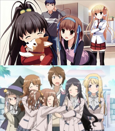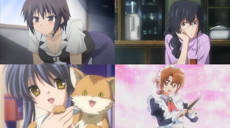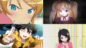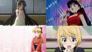 Le sorelle minori (imouto) e quelle maggiori (onee-san) sono altri personaggi ricorrenti, che hanno ruoli più o meno vari. La prima caratteristica del quale accertarsi è l’assenza o la presenza di un effettivo legame sanguigno con la sorella: nel caso questo sia assente (e stando a quanto posso ricordare, solo nel caso di un’imouto) essa sarà anche sentimentalmente interessata al protagonista (o assolutamente disinteressata). In questo caso è anche una relazione senza speranza poichè i protagonisti maschili, spesso pappemolli, saranno di media in grado di mettere in chiaro i loro fraterni sentimenti: caso esemplare è Kanako di Love Hina. Altro anime interessante per la presenza di ben tre imouto è Papa no Iukoto o Kikinasai!, bellissimo e commovente slice of life di qualche anno fa; fra le commedie romantiche arricchite da fan service invece c’è Kono Naka ni Hitori Imouto ga Iru, in cui il protagonista deve sposarsi per ereditare il colosso industriale del padre, e per trovare una moglie si trasferisce in un istituto dove però scopre esservi anche segretamente iscritta una figlia illeggittima di suo padre, e deve assolutamente evitare una relazione sentimentale con questa. Esempi di sorelle minori più classiche, non ossessionate dal protagonista sono Kirino di Oreimo, Kobato di Haganai (che soffre anche di chuunibyou… ne parlerò un altro giorno) e consideriamo tali anche la coppia Karen&Tsukihi di Bakemonogatari… da questi esempi potete immaginare che le imouto si rivelano essere più fonti di preoccupazione e stress che di altro. Nel caso delle onee-san, invece, qualora via sia interesse sentimentale (da parte del protagonista previa l’assenza di legami di sangue) la situazione si ribalta: è il fratello a dover faticare per togliersi di dosso l’etichetta che ritiene soffocante… laddove non c’è interesse sentimentale, invece, si tratta di personaggi spesso maturi che passano il loro tempo a tenere a bada i giovani scalmanati, o in altri, rappresentano un ostacolo per il protagonista che si ritrova ad avere un violento vigilante sempre alla calcagna. Tenete presente inoltre che il titolo onee-san può essere attribuito anche a personaggi femminili più anziani, maturi e affidabili, anche in assenza di legami di parentela. Alcuni esempi di onee-san con legame di sangue possono essere Akira Yoshii (Baka to Test) e Nanami Kirishima (Ano Natsu de Matteru), mentre per personaggi con atteggiamenti da sorella maggiore Misae Sagara (Clannad) e Maria-san (Hayate no Gotoku).