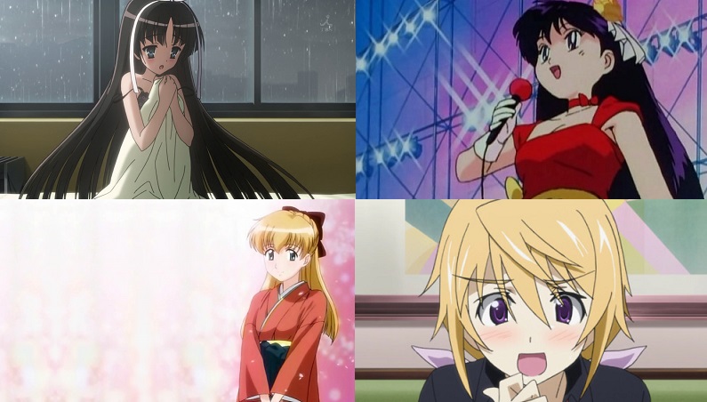 Altro personaggio caratteristico è la straniera, che è anche una studentessa trasferita: una delle caratteristiche più costanti di questi personaggi è di avere i capelli biondi. Sebbene negli anime di vedano capelli di ogni colore che la tavolozza possa garantire, spesso vi è il riferimento al fatto che il colore tipico dei capelli in Giappone sia il nero, o il marrone, e quindi questi personaggi di origine europea o americana vengono caratterizzati da un colore che secondo l’immaginario giapponese è tipico dalle nostre zone. Da non confondere con quei personaggi che tingono i loro capelli, atto visto dalla società nipponica come forma di ribellione giovanile. Nelle commedie romantiche questi personaggi hanno principalmente due punti a favore: la novità che portano con se con il loro trasferimento, e il fatto che avendo vissuto altrove e spesso all’estero, hanno acquisito costumi differenti, e sono quindi più emancipate e oneste per quanto riguarda i loro sentimenti… non rammento una straniera con toni tsundere (potrebbe esserci, semplicemente potrei non ricordarmene), come pure non mi pare di ricordare alcun lieto fine con un personaggio di questo tipo. Spesso hanno il ruolo di animatori, o completano le gag combinandosi con i vari personaggi. Cito Tina Foster (Sempre più blu) e Charlotte Dunois (Infinite Stratos, per il ruolo centrale in più episodi). In opposizione alla “straniera” spesso in alcuni anime è possibile trovare la “sacerdotessa”, che rappresenta invece appieno le caratteristiche tipiche della donna giapponese, anche se spesso solamente in apparenza (vedi Shirayuki di Hidan no Aria e Rei Hino aka Sailor Mars).
