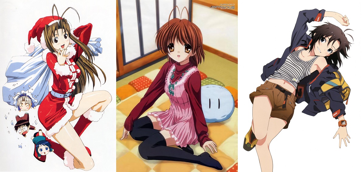 Altra caratteristica importantissima di cui tenere conto è la presenza o meno di un’ahoge, ideato da Osamu Tezuka stesso: un ciuffo di capelli ribelli che spesso spunta dalla testa del personaggio e non domabile in nessun modo. L’ahoge indica personaggi imbranati, pasticcioni, a volte proprio stupidi, ma l’uso di questo elemento grafico non si limita solo a indicare caratteristiche del personaggio, bensì essa si muove e adatta in base alla scena. Vi sfido a guardare qualche anime a sfondo umoristico/romantico e prestarvi attenzione: io vi fornisco un video, senza sottotitoli perchè sono cattivo, preso da Chuuninbyou demo Koi ga Shitai (non l’avete visto? Cosa state aspettando?) Discorso a parte per le antenne, due capelli anche loro al centro della testa che tendono verso direzioni opposte ed indicano spesso personaggi femminili insicuri e dotati di doppia natura (in alcuni casi tsundere).