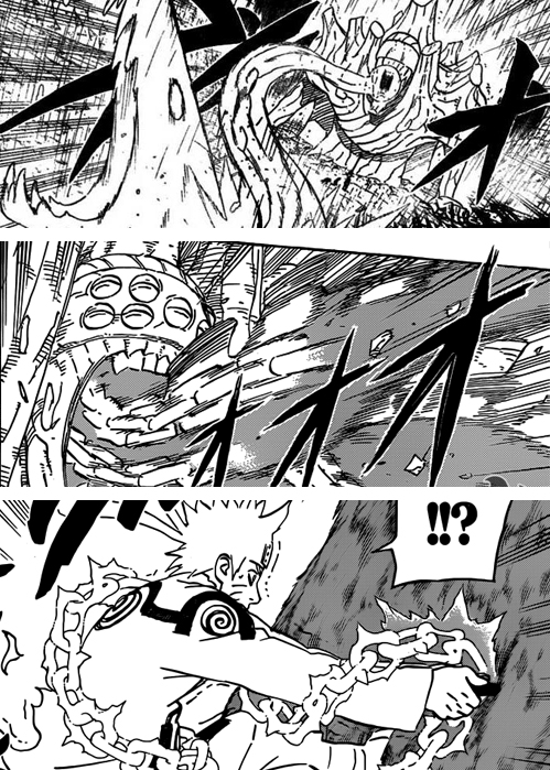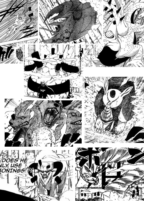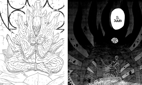 Terza domanda: come riesce a manipolarli, e come mai le sue evocazioni hanno il Rinnegan? La risposta ad entrambe le domande sembra abbastanza semplice: con le sbarre della Statua Diabolica li controlla usando il chakra, gli occhi compaiono su tutti quelli che controlla come “riflesso” della manipolazione stessa. La stessa cosa infatti accade quando Sasuke ipnotizza Manda, quando Tobi controlla il Gobi o il Kyubi, oppure ancora sempre con Tobi che controlla le sei Forze Portanti resuscitate da Kabuto (in questo caso poi, hanno il Rinnegan sull’occhio sinistro e lo Sharingan sul destro, proprio come Tobi).