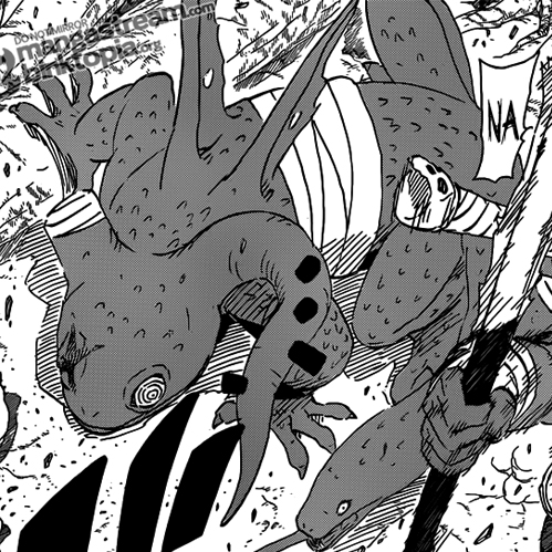 Parto con alcune considerazioni. Durante lo scontro con Jiraya, Fukasaku e Shima, Pain utilizza il Camaleonte, ma questo viene letteralmente tagliato a metà da Pà con la tecnica “Guerra di parole: uccidere”. Come è possibile che sia vivo? Contro Naruto infatti Nagato evoca nuovamente questa creatura, ma possiamo osservare che la zona in cui ha subito la ferita mortale è fasciata. Tra le creature vediamo inoltre uno pterodattilo, il primo essere preistorico che vediamo nel manga e ciò porta a pensare che non vi siano esseri di ere passate (a parte forse i Biju, non sappiamo quanti anni abbiano). Quindi come fa Nagato ad evocarlo? Ci potrebbe essere una soluzione ad entrambe le domande, ovvero che col Rinnegan si possono evocare creature morte (quindi, sia creature moderne ma uccise, sia animali preistorici magari rivitalizzati col Gedou Rinne Tensei): questo spiegherebbe anche il secondo dubbio che ho sollevato, ovvero la strana eterogeneità delle sue evocazioni. Penso a questo punto che con il Rinnegan si possa evocare qualsiasi cosa, Nagato ha semplicemente scovato le bestie più incredibili di sempre e le ha conservate (come i corpi di Pain). Anche quando esse vengono ferite mortalmente, essendo manipolate come dei burattini, questo non va ad interferire con la tecnica, in sostanza non possono morire (sempre che siano vivi). Inoltre, cosa solo le alette che quasi tutte le Evocazioni del Rinnegan hanno sulla schiena? Sembra evidente che siano una modifica fatta dall’utilizzatore stesso, ma sinceramente non riesco ad immaginare nessuna utilità pratica in due minuscole ali che non permettono di volare, potrebbe essere semplicemente una scelta estetica (non proprio azzeccatissima secondo me, su alcuni stonano molto).