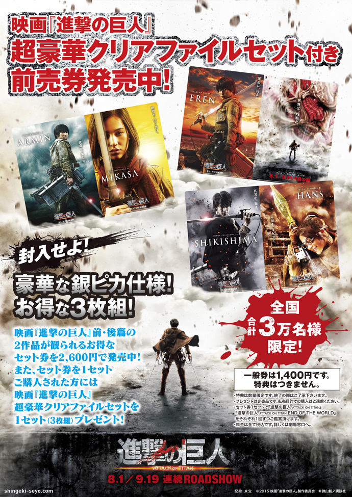Il regista Shinji Higuchi aveva già fatto sapere a luglio che il lungometraggio sarebbe stato diviso in due film, supervisionati dallo stesso Hajime Isayama, autore del manga originale, e che la storia si sarebbe basata sul mondo e i personaggi del manga, con l’aggiunta di personaggi originali e nuovi avversari. Yuusuke Watanabe (Dragon Ball Z: Battle of Gods, il live-action di Gantz, Gantz II: Perfect Answer, 20th Century Boys, Gatchaman) ha scritto la sceneggiatura insieme a Isayama e al critico cinematografico Tomohiro Machiyama.