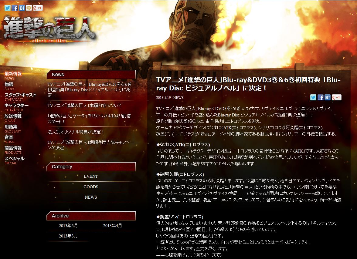 Il sito web ufficiale dell’anime di L’attacco dei giganti ha annunciato, domenica della scorsa settimana, che le prime copie del terzo e del sesto volume dell’edizione in Blu-ray della serie animata includeranno delle visual novel come contenuto aggiuntivo. I videogiochi racconteranno, come spinoff, alcune storie originali con protagonisti Mikasa, Levi, Erwin, e altri personaggi.