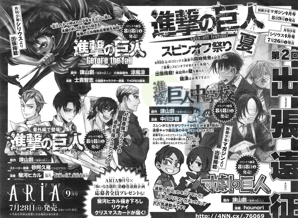 Sabato della scorsa settimana il numero di Agosto della rivista ARIA edita dalla Kodansha ha annunciato che ben quattro spinoff del manga L’Attacco dei Giganti vedranno la pubblicazione di un nuovo volumetto l’8 Agosto di quest’anno. Il quarto numero di Shingeki! Kyojin Chūgakkō (L’attacco dei Giganti alle scuole medie) di Saki Nakagawa, il primo volume dello yonkoma manga Sungeki no Kyojin di hounori, il terzo volume di Shingeki no Kyojin: Before the Fall (L’attacco dei Gigant: prima della caduta) di Satoshi Shiki e Ryō Suzukaze, e il secondo volume di Shingeki no Kyojin Gaiden: Kuinaki Sentaku (L’attacco dei Giganti: nessun rimpianto) di Hikaru Suruga e Gan Sunaaku, usciranno contemporaneamente in occasione della compagna promozionale Shingeki no Kyojin Spin-off Festival: Summer.