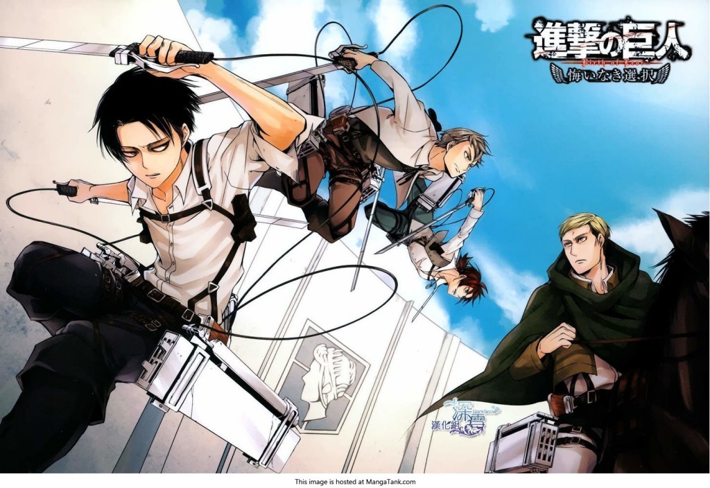Per quanto riguarda Shingeki no Kyojin Gaiden: Kuinaki Sentaku, il primo capitolo è stato pubblicato sul numero di Gennaio della rivista ARIA. Il manga racconta il passato di Levi e il suo primo incontro don Erwin. Suruga sta disegnando il manga e Sunaaku (Suisei no Gargantia) della Nitroplus ne sta scrivendo la sceneggiatura.