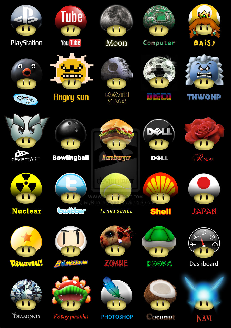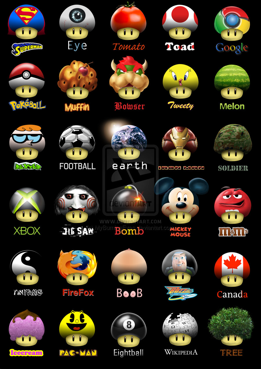 È una piccola creatura sferica rosa protagonista del videogame della Nintendo il cui principale punto di forza è di mangiare gli avversari per acquisirne il potere. Da qui nasce l’idea di Mathijis (su deviantart MyBurningEyes) di pensare come sarebbero diventati Mario o Luigi prendendo caratteristiche più insolite, più fantasiose. Da quel momento ha speso buona parte delle sue energie per creare quattro poster, ognuno composto da novanta figure di funghetti molto speciali.