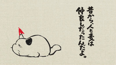 La prima delle tre pubblicità era stato realizzata dallo Studio Ghibli per festeggiare il 110 anniversario della Nisshin Seifun Group. Goro Miyazaki aveva sceneggiato lo spot e il direttore delle animazioni di Ponyo, Katsuya Kondo, aveva supervisionato la realizzazione della pubblicità. Yamori, il duo composto da Ryōko Moriyama e Akiko Yano aveva interpretato la canzone Tadaima no Uta.