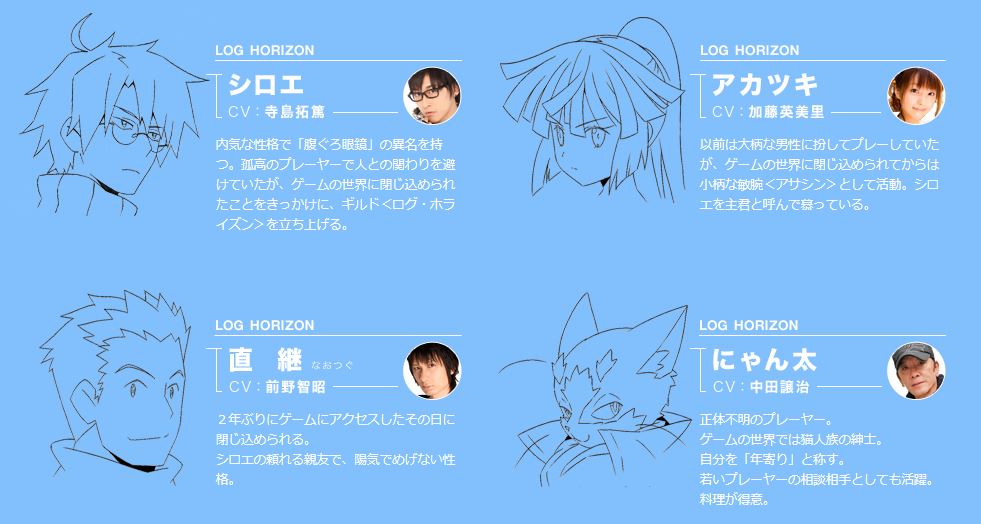 Mercoledì di questa settimana sono stati annunciati i nomi dei doppiatori che presteranno la propria voce ai protagonisti dell’adattamento animato del romanzo Log Horizon, scritto da Mamare Touno. Takuma Terashima doppierà Shiroe, il protagonista della serie, Emiri Katō doppierà Akatsuki, Tomoaki Maeno doppierà Naotsugu e Jouji Nakata doppierà Nyanta.