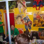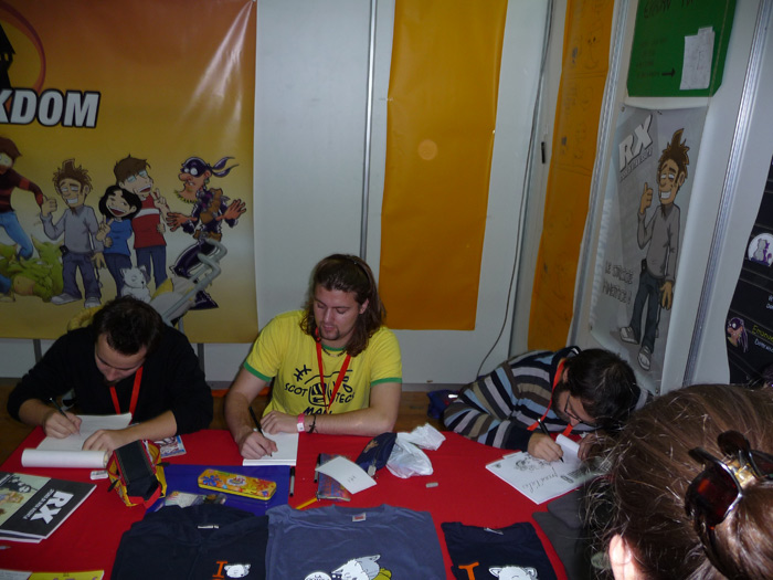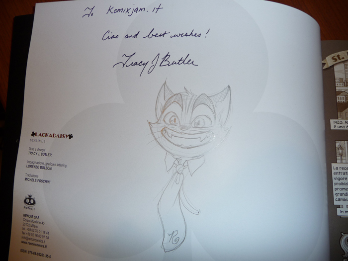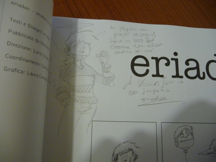 Dopo una bella mezz’oretta di fila ho conosciuto Eridian, molto simpatico e, mentre mi faceva un suo personale autografo, gli ho chiesto del suo cane e gatto: “ma sono veramente così?” e lui: “Si, sono pestiferi. Sono perfino troppo buono nei disegni” Aha! Me li immagino… Ricevuto l’autografo, mi sono diretto verso il prossimo stand, lasciando due spillette del nostro sito…