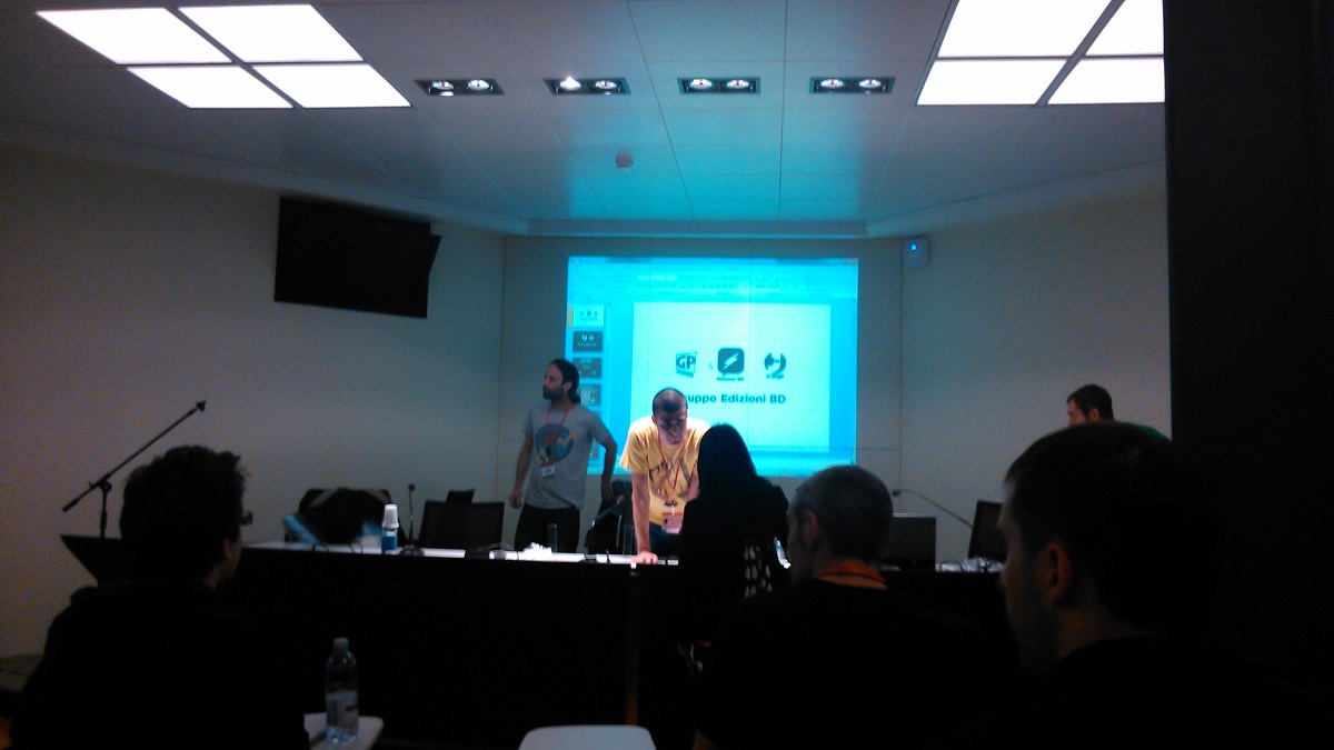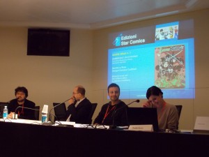 E la Panini? Non riuscirò mai a capire pienamente questa casa editrice, non ci riesco dai tempi di Marvel Manga (cosa che solo i vecchi come me possono capire) ma quest’anno ancor di meno per la loro scelta di portare Inio Asano (Solanin e Buonanotte Pun Pun), autore complesso, non adatto al grande pubblico sebbene produca opere studiate e pregne di significato. Non ne azzeccano una: l’anno scorso portarono un autore inadatto al contatto col pubblico (Takeshi Obata) e quest’anno uno che il pubblico non lo conosce neppure. Come se non bastasse, per qualche misteriosa ragione hanno portato solamente i primi sei dei nove volumi pubblicati de L’attacco dei Giganti… non voglio esprimermi, neppure sul fatto che pare questo manga sia andato quasi esaurito (e di copie ne hanno portate tantissime). Poi c’era Ortolani, come ogni anno, ma degli italiani preferisco ve ne parli bila… sebbene incrociavo Davide La Rosa almeno ogni due ore… La Rosa presente alla conferenza Star Comics che non ha mancato di stupire e divertire il pubblico. Andare a questi incontri è sempre interessante, perchè ti mette in contatto con quelle persone che fanno un lavoro fondamentale per gli appassionati di manga e fumetto come il sottoscritto, d’altronde: senza Star Comics io non avrei letto in italiano neppure la metà dei miei manga preferiti. E poi io, questo lavoro fatto di contatto con il pubblico moderno, non lo farei mai; quindi cresce di anno in anno la stima per queste persone.