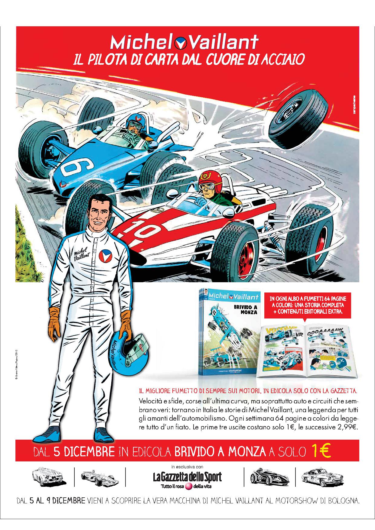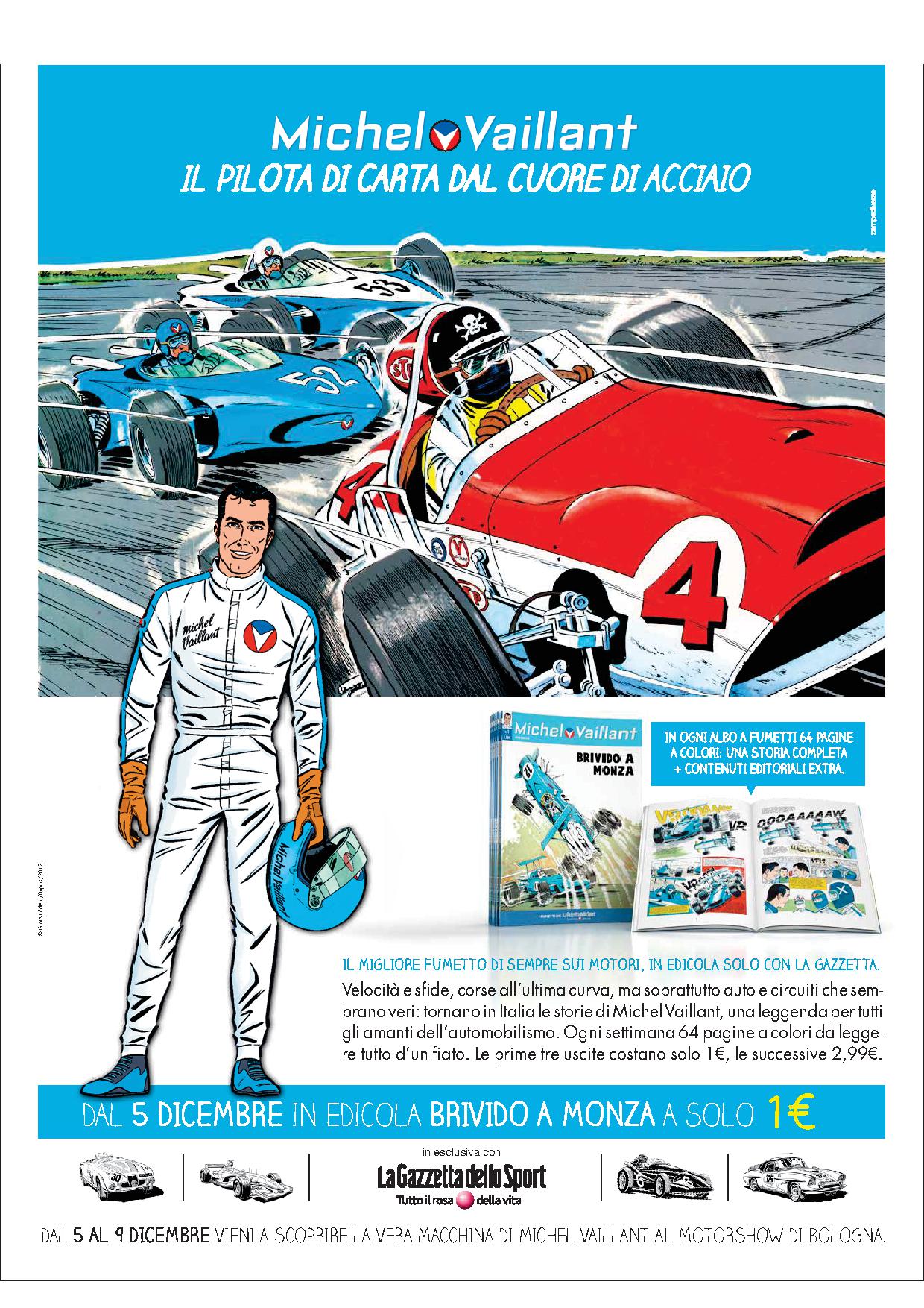 Per tutti gli amanti delle storie sportive e dell’intrigo, La Gazzetta dello Sport presenta una pubblicazione unica e mai vista prima delle storie del pilota della scuderia Vaillant: a partire dal 5 dicembre, in edicola con La Gazzetta, sarà possibile acquistare il primo numero della collezione “Michel Vaillant”, dal suggestivo titolo “Brivido a Monza” al costo di 1 euro. Le successive due uscite avranno lo stesso costo, mentre dalla quarta uscita in poi, il prezzo si assesterà sui 2,99 euro. Parallelamente a questa iniziativa, inoltre, dal 5 al 9 dicembre La Gazzetta dello Sport sarà presente al Motorshow di Bologna, dove ci sarà l’esposizione della macchina di Michel Vaillant realizzata da Chevrolet, che ha corso e vinto il WTCC di Portimao quest’anno.
