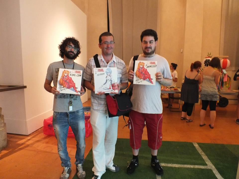 E’ giunta l’ora del fan meeting e dell’estrazione dei premi a sorpresa. Tra le varie domande e relative risposte, sono stati estratti da me e i miei colleghi Shinji e Slanzard prima e da Sadamoto poi, tre fan a caso più uno, che hanno vinto una copia dell’artbook Carmine. Ai quattro vincitori se ne è aggiunto un altro: a causa di una piccola incomprensione, per Komixjam ci sono stati ben due vincitori. Stretta personalmente la mano a Sadamoto, vado in ricerca del nostro vincitore ufficiale per chiedergli una foto per il blog, ma, ahimè, si era già dileguato.