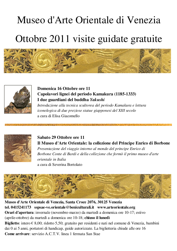 La seconda mostra di cui vado a parlarvi si trova a Venezia, più precisamente al Museo d’Arte Orientale della città. E proprio il museo, nel mese di ottobre organizza delle visite guidate e gratuite all’interno del proprio museo. Le date in cui sono previste queste visite guidate sono domenica 16 ottobre alle ore 11 e sabato 29 ottobre sempre alle 11. Nella prima data sarà possibile osservare i “Capolavori lignei del periodo Kamakura(1185-1333) – I Due Guardiani del Buddha Yakushi. La seconda data è dedicata invece al Principe Enrico di Borbone e alla sua collezione privata che organizzò girando per il mondo. Collezione che venne usata per mettere su il primo museo d’arte orientale in Italia.