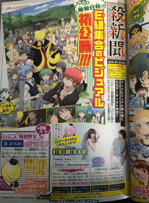 Lunedì di questa settimana con la pubblicazione del quarto e del quinto numero di quest’anno della rivista Weekly Shonen Jump edita dalla Shueisha è stato dato l’annuncio ufficiale che moumoon interpreterà la sigla di chiusura dell’anime Assassination Classroom intitolata Hello, shooting-star. Il singolo della canzone sarà messo in vendita a Febbraio. Moumoon è un duo di artisti composto dalla cantante e autrice di testi Yuka e dal compositore e chitarrista Kōsuke Masaki. Insieme hanno composto numerose canzoni che hanno fatto da tema agli anime di One Piece Episode of Merry: Mō Hitori no Nakama no Monogatari, Yu-Gi-Oh! Zexal, To e Viper’s Creed.