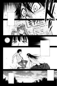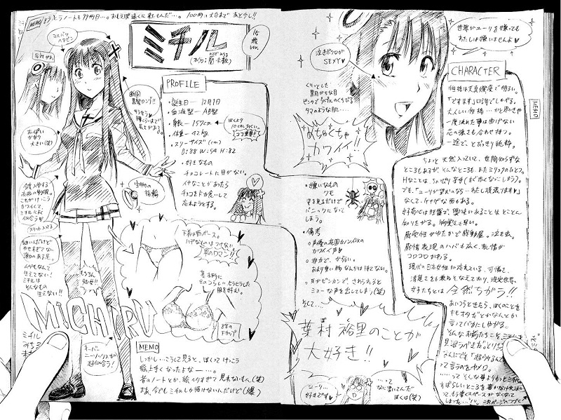 La storia, come potete immaginare è abbastanza semplice, non così scontata grazie a un paio di colpi di scena ben assestati (soprattutto al terzo volume) e comunque non viene tirata avanti all’infinito. Storie che parlano di ideali, di donne e amori ideali, dal punto di vista degli “scrittori” non possono che avere un finale ideale. L’unica pecca, a mio avviso tranquillamente superabile, è lo stile di disegno di Watanabe: come tratto è indubbiamente immaturo e necessita di tanto lavoro per essere migliorato, soprattutto per l’uso di alcune proporzioni troppo “cartoonate” del corpo umano; figure femminili che danno un effetto slanciato, voluto per aumentare l’attrattiva di questi personaggi, affiancate da un protagonista che al loro confronto appare gobbuto, sciancato se posso usare un’iperbole, che tanto ha stonato anche al mio occhio (che è risaputo essere molto comprensivo). Buoni i fondali e i tanti piccoli particolari aggiunti con cura, come le note sui quaderni che componevano il profilo di Michiru che di tanto in tanto appaiono, disegnati anche con lo stile che userebbe una persona di quell’età… la Michiru che Yuri disegnava a cinque anni è veramente il disegno che farebbe un bambino (forse con più colori a casaccio, ma i manga sono in bianco e nero).