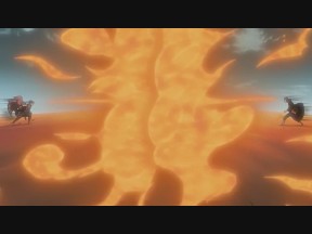 Tocca proprio a Sasuke attaccare. Itachi inizialmente schiva gli shuriken scagliatigli contro dal fratello, ma quest’ultimo, con un abile contromossa, lo ferisce! Lo Tsukuyomi sembra aver sfiancato Itachi! Sasuke, nota il momento di difficoltà del fratello e lo riattacca: questa volta con l’arte del fuoco. Lo scontro, ora, si sposta all’aria aperta, sul tetto del covo degli Uchiha. I due Uchiha si scontrano con l’altrà abilità caratteristica del clan Uchiha, oltre allo Sharingan: l’arte del fuoco. Itachi tuttavia utilizza una nuova tecnica: Amaterasu! Nere fiamme escono dal suo Sharingan e avvolgono le fiamme di Sasuke, estinguendole! Anche Zetsu è sorpreso da questo strabiliante potere! Itachi, quindi,utilizza Amaterasu per colpire Sasuke. Questi, avvolto dalle fiamme, cade sconfitto! Itachi, si avvia verso il corpo del fratello, per prendersi gli occhi. Ma una volta giunto li, il corpo svanisce! Sasuke ha utilizzato una tecnica di Orochimaru per scappare dalle fiamme nere e ora sferra diversi attacchi, sempre con l’arte del fuoco! I due fratelli ormai sono stremati e a corto di chakra. Ma Sasuke sembra aver un asso nella manica!!!