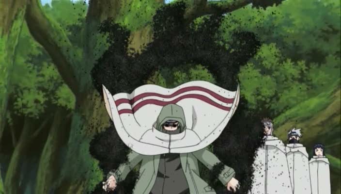 Perplessi, Kakashi e Shino ipotizzano che il loro avversario si faccia attraversare dai loro attacchi, utilizzando una sorta di tecnica di teletrasporto per uscirne illeso!