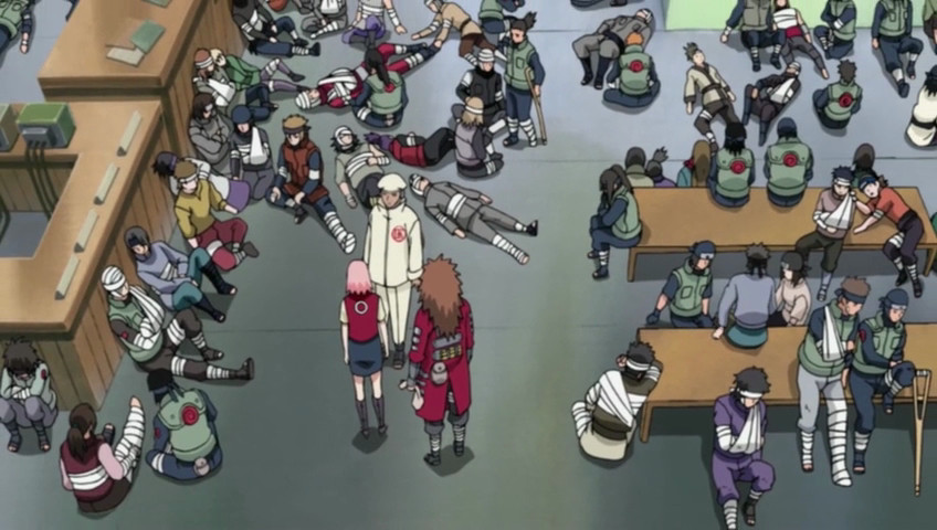 I due anziani consiglieri, Homura e Koharu, appreso da Danzou, che l’artefice dell’attacco è Pain in persona, si recano da Tsunade, con l’intento di chiedere all’Hokage di far rimanere nascosto Naruto. Tsunade non ci sta, e, arrabbiata, ricorda ai due, l’importanza di avere fiducia nelle generazioni future, di credere in loro! Cosi come ai loro tempi fecero il Primo e il Terzo Hokage, e la vecchia Chiyo! Quindi dà l’ordine di mandare a chiamare Naruto, mentre lei si occuperà dei feriti, grazie anche all’aiuto di Katsuiu (l’enorme lumaca!). Ordine che non verrà eseguito, visto che Danzou ammazza il rospo messaggero incaricato di tale compito!