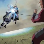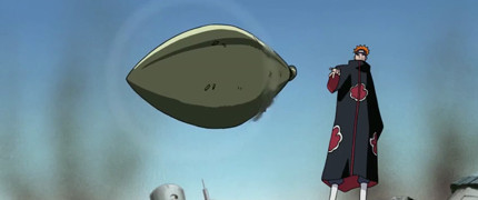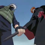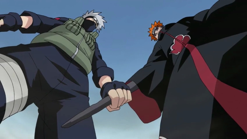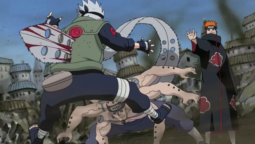 Kakashi, Choza, Choji e altri shinobi giunti sul campo di battaglia attaccano Pain…ma questi respinge tutti gli attacchi, anzi contrattacca seduta stante mettendo al tappeto la maggior parte dei presenti con uno jutsu devastante! Ora, sono solamente Kakashi e i due Akimichi a essere in grado di combattere. Il copia-ninja, deduce, inoltre, dal particolare modo di combattere del nemico, che questi utilizzi una specie di forza elettromagnetica che attrae e respinge i corpi, e che per utilizzarla ha bisogno di un periodo di “ricarica” di 5 secondi!!! Appreso ciò, i tre tentano un attacco a sorpresa…che fallisce. Kakashi è bloccato. Pain non vuole rischiare, prende un chiodo e lo scaglia contro di lui!!!