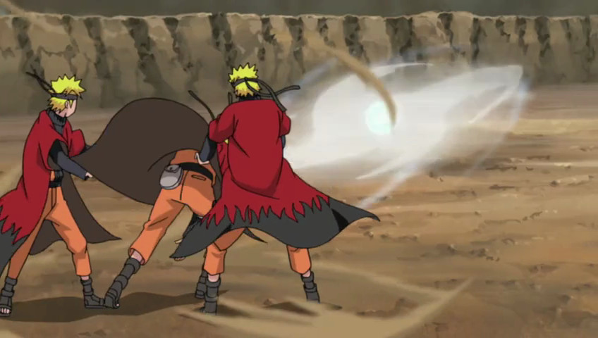 Sarà Fukasaku a evocarla e a permettere a Naruto di scagliare un altro RasenShuriken! Jutsu assorbito da Pain, però! Lo stesso Pain che Naruto aveva battuto precedentemente! Pare che uno dei Pain rimasti sia in grado di riportare in vita i corpi! Appurato ciò, Naruto decide di concentrarsi su quest’ultimo avversario e con un abile stratagemma atterra sia lui che il Pain “assorbente”, rimane Pain Mondo dei Deva, che si vede arrivare un RasenShuriken incontro!!!