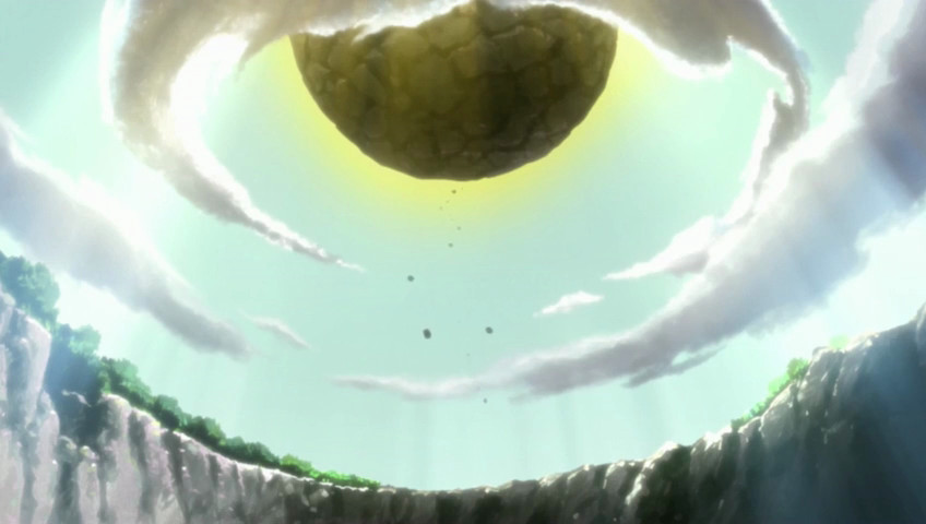 Pain intanto si porta fuori dal villaggio, seguito da Naruto…qui utilizza un nuovo e potentissimo jutsu: il Chibaku Tensei!
