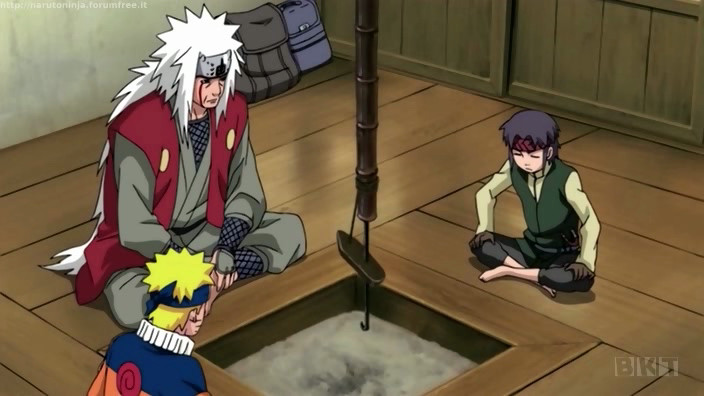 Qui incontrano Tanishi, una vecchia conoscenza del maestro che sbarra loro l’entrata al villaggio. Stranamente il villaggio è recinto da delle mura. Naruto e Jiraiya desistono, per ora, nell’entrarvi…normalmente.