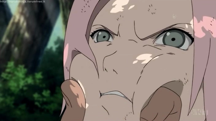 Nei boschi, Naruto fantastica su come potrebbe far colpo sulla rosea collega, quando un piccolo gruppo di individui passa proprio sotto di loro. Sono i ladri…e sono in difficoltà. Il mulo che trasporta il tesoro rubato sta per cadere in un precipizio. Il biondo ninja di Konoha e l’Uchiha si fiondano sulla refurtiva, precipitando insieme al malcapitato animale. Sakura tenta di richiamare l’attenzione di Kakashi, ma a quanto pare il fulmine (?) non giunge a destinazione. Il capo dei criminali, accortosi della ragazza, la prende in ostaggio. Questo tizio ha una insolita abilità legata ad un altrettanto bizzarro liquido, molto simile all’acqua, presente nel suo corpo.