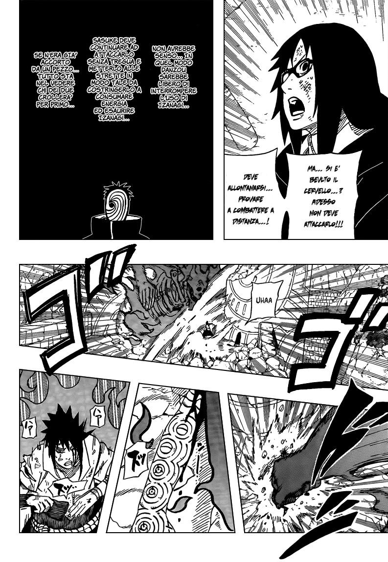 Riassunto: Lo scontro tra Sasuke e Danzou pare giunto al culmine. Certo, stavolta l’avversario è davvero un osso duro. Come ci spiega molto gentilmente Madara, Izanagi è un genjutsu molto speciale: agisce su chi lo pratica, e può trasformare la realtà in illusione, annullando quindi un colpo ricevuto o persino la stessa morte dell’utilizzatore. Tutto questo, a costo dell’occhio che ha lanciato la tecnica. Karin, però, ha capito tutto: ogni occhio sul braccio di Danzou può utilizzare Izanagi una sola volta e per un tempo massimo di 60 secondi. A quanto pare, però, Sasuke se n’era già accorto da un po’, e sta infatti tartassando Danzou per costringerlo ad esaurire gli occhi al più presto. Poi, uno scontro frontale. Il chidori di Sasuke contro il Fuuton di Danzou. Chi è stato colpito? Chi vince? chi perde? Cosa è reale? Cosa è fittizio?